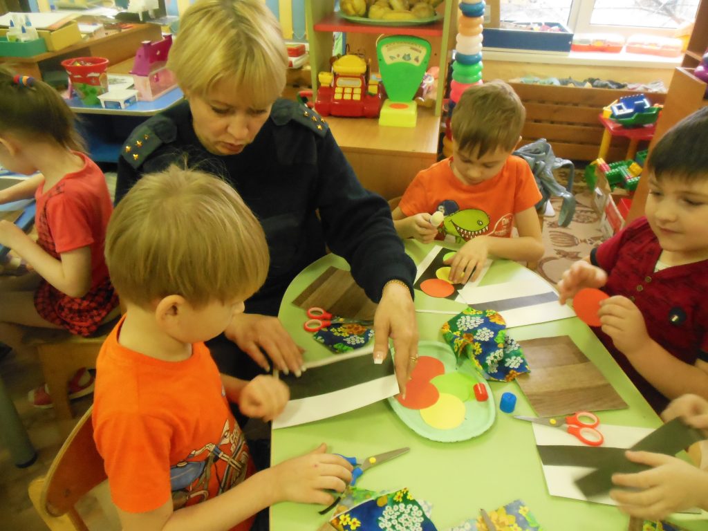 Автоинспектор провела с детьми интегрированное занятие «Конструирование». Аппликация из традиционных «детских» материалов, таких как цветная бумага и картон является одной из самой распространённой и любимой техник у дошколят.
