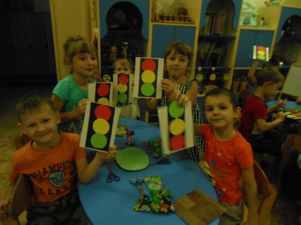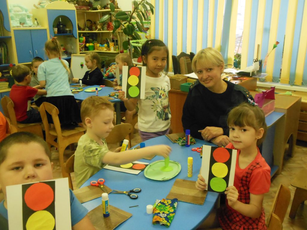 Прежде чем приступить к работе, воспитатель приготовила набор материалов, которые ребята использовали в процессе изготовления светофора: цветную бумагу подходящих оттенков — красного, жёлтого и зелёного, белую и серую бумагу, и всё остальное, что было необходимо для работы. Стараясь располагать цветные кружки чётко друг под другом, как они располагаются в настоящих светофорах, воспитанники проговаривали вместе с инспектором действия участников дорожного движения при том или ином сигнале светофора.